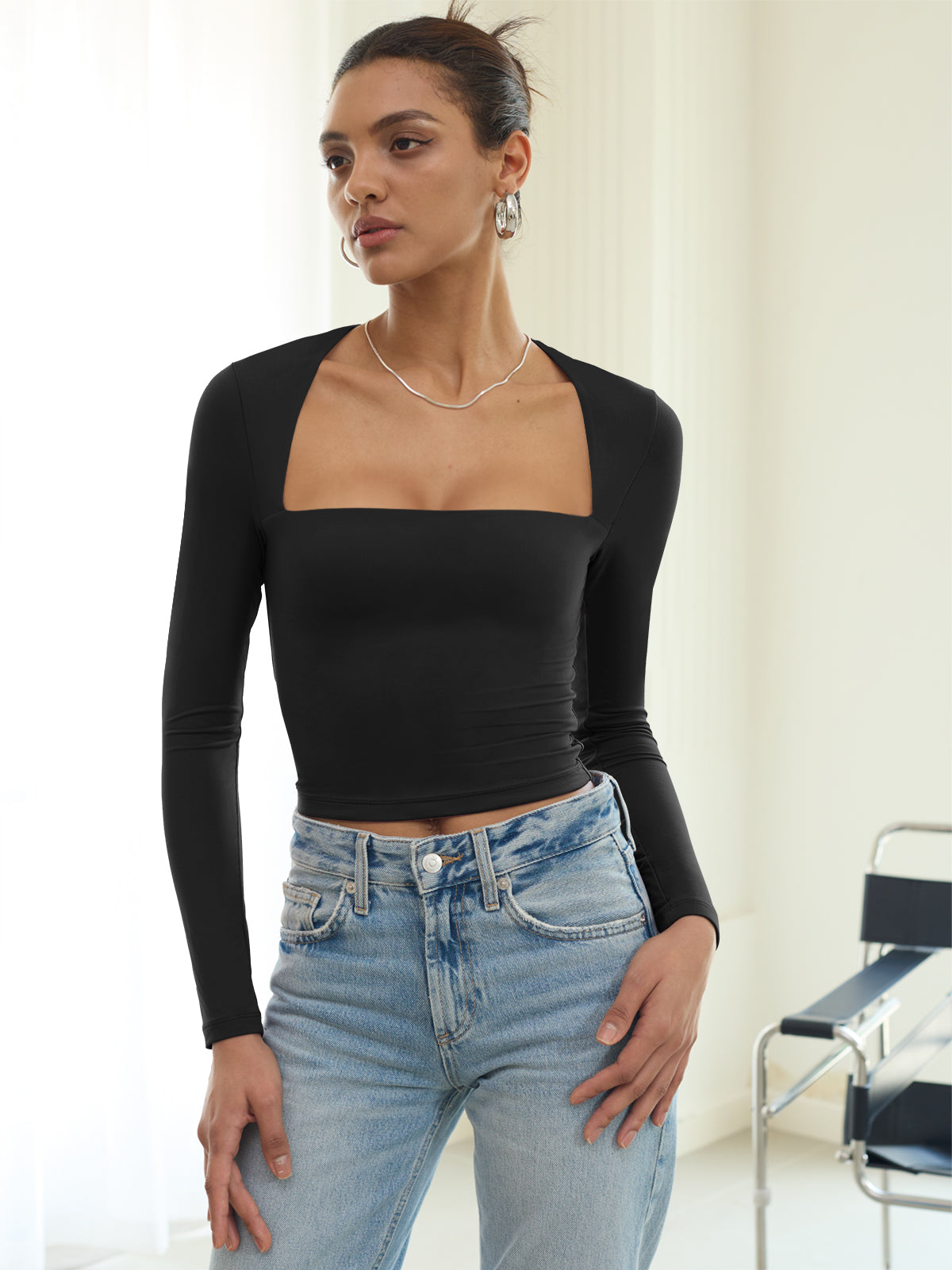 Square Neck Long Sleeve Shirts Double Lined Tops Tight Shirts