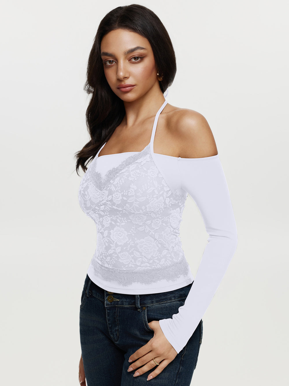 • Design: This lace top features a faux layered look, combining an off-shoulder long sleeve base with a built-in lace overlay in a halter neckline style. The floral lace detailing adds a romantic, feminine touch, while the fitted silhouette enhances your natural shape. Get the trendy layered look in one easy-to-wear piece—no layering required.
