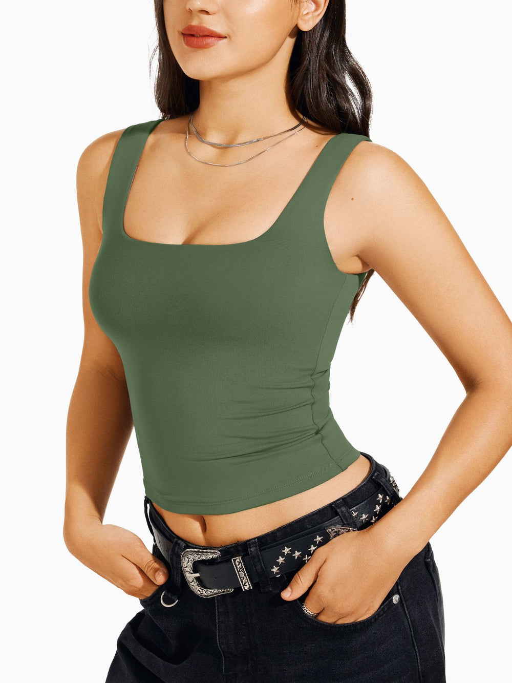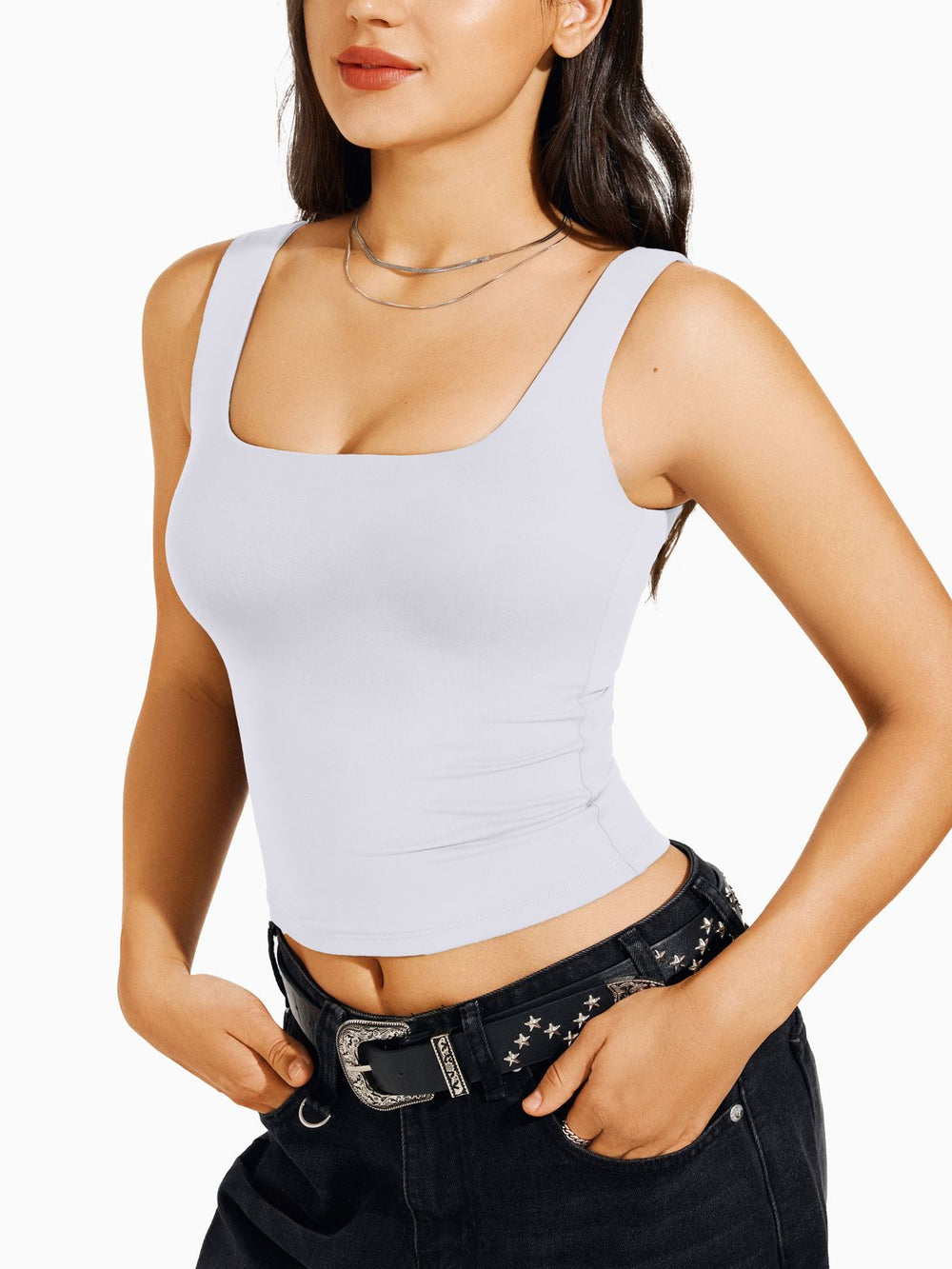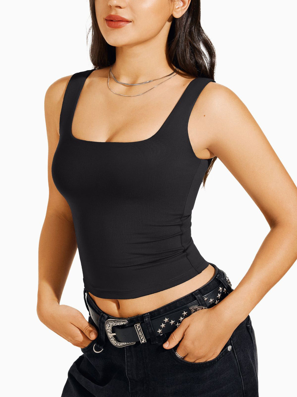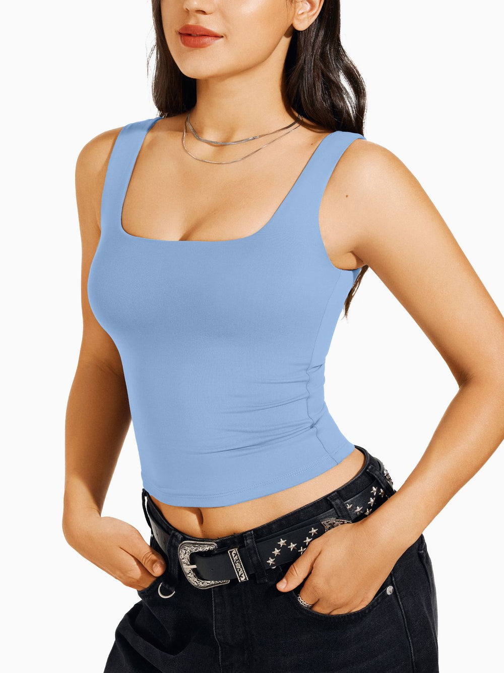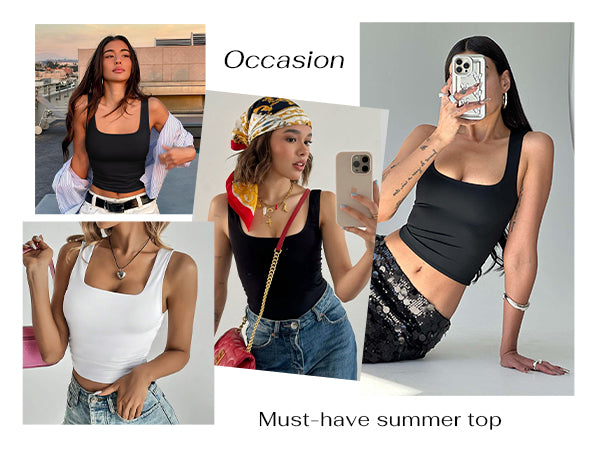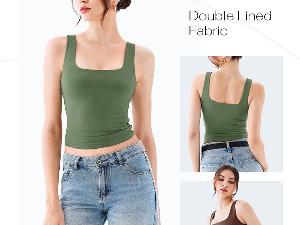 🌸 Design & Features: This crop top features a square neckline that elegantly shows off your collarbone and a hint of cleavage, a sleeveless fitted design to keep you cool and comfortable, and a double-lined finish for full coverage, so you can skip the bra with confidence.