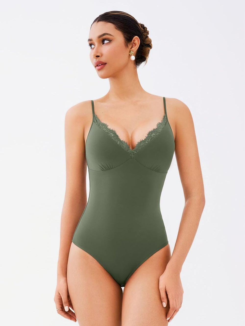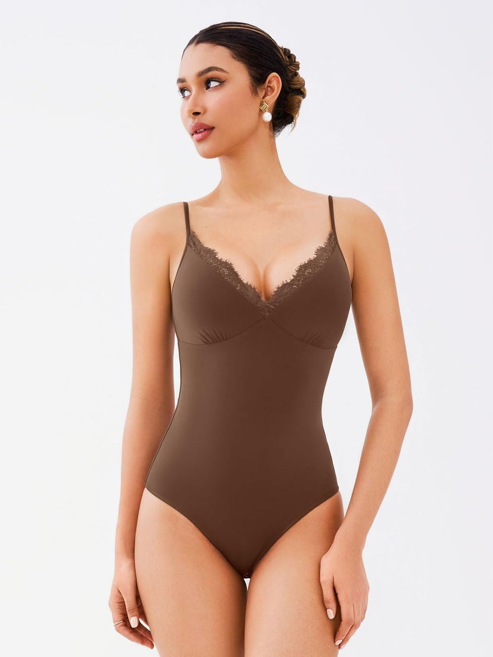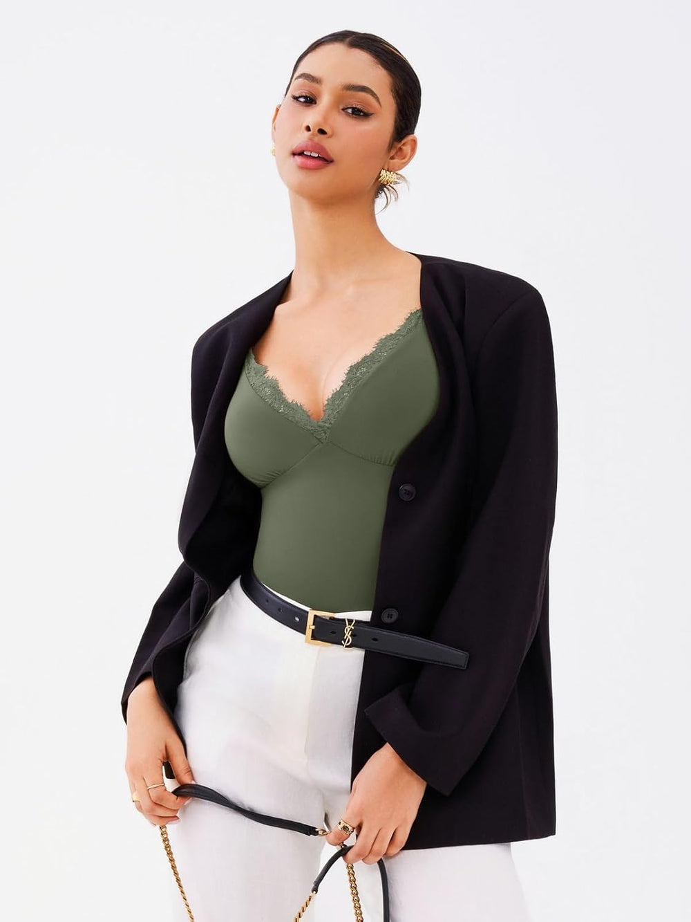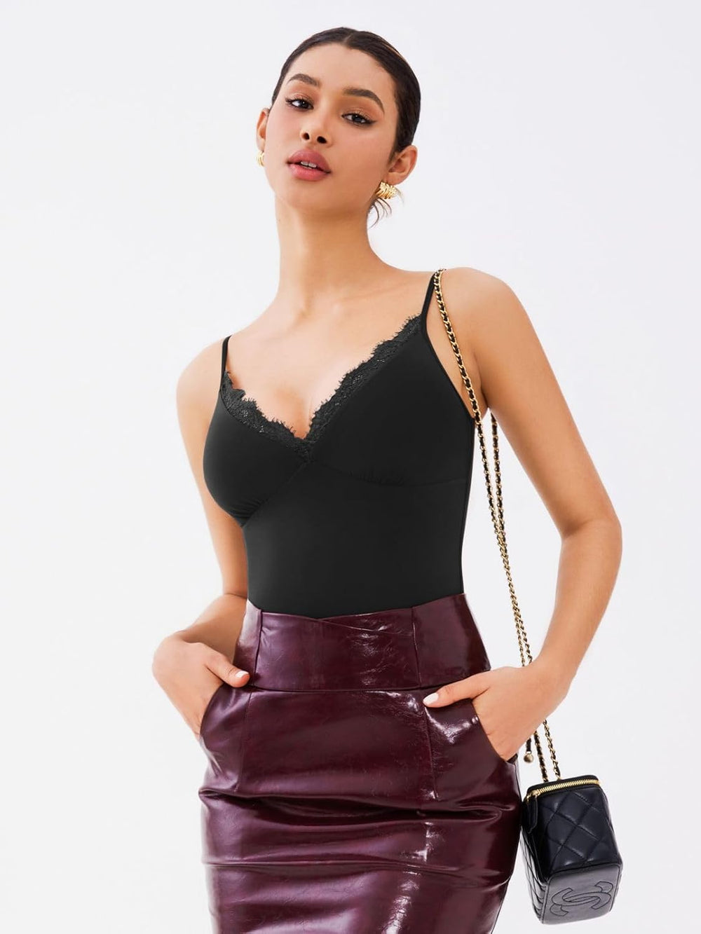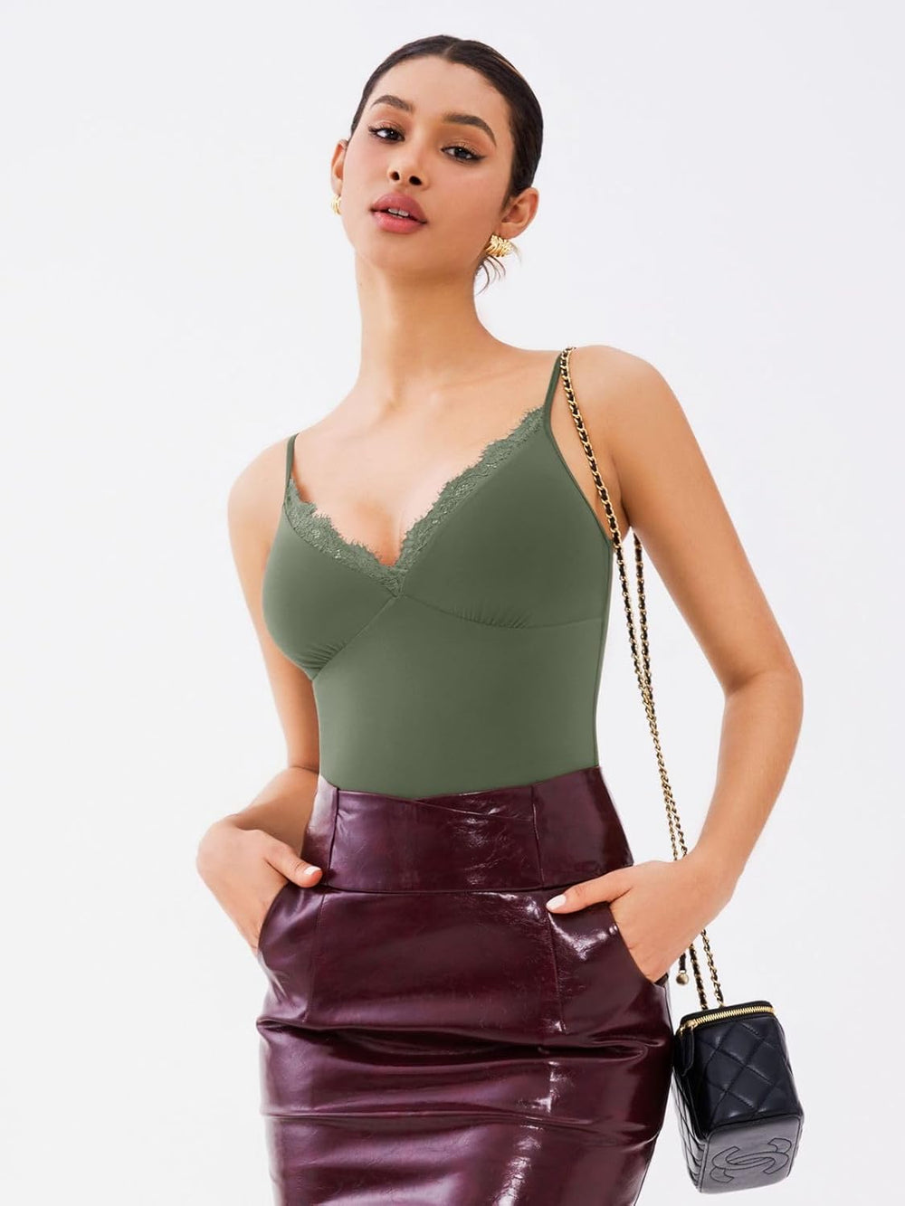 Designer Collection: This women's bodysuit combines a deep V-neckline with delicate lace trim and adjustable straps, blending elegance with sensuality. Part of the 2025 Spring/Summer Designer Collection, it’s perfect for creating chic, modern looks.