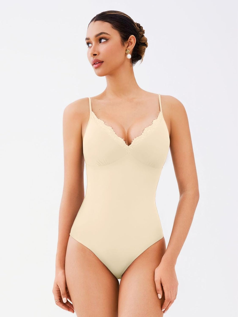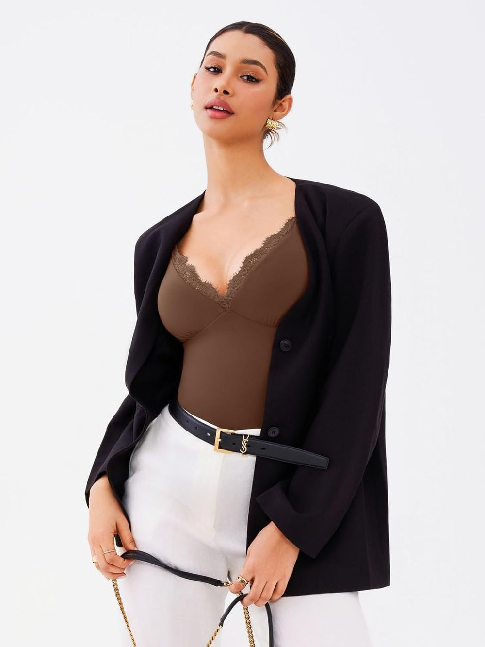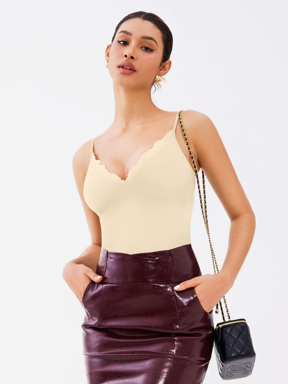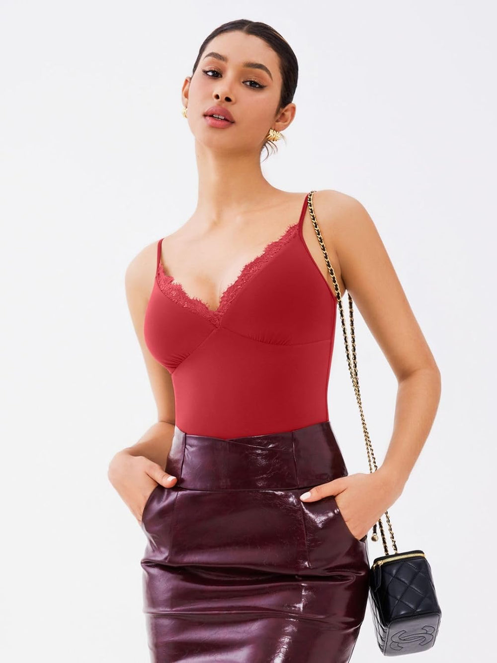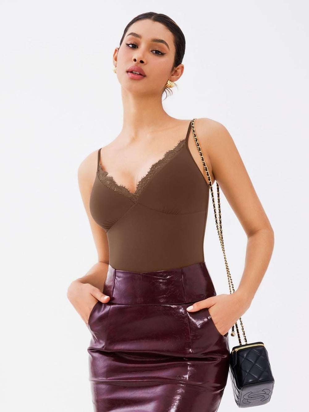 Designer Collection: This women's bodysuit combines a deep V-neckline with delicate lace trim and adjustable straps, blending elegance with sensuality. Part of the 2025 Spring/Summer Designer Collection, it’s perfect for creating chic, modern looks.
