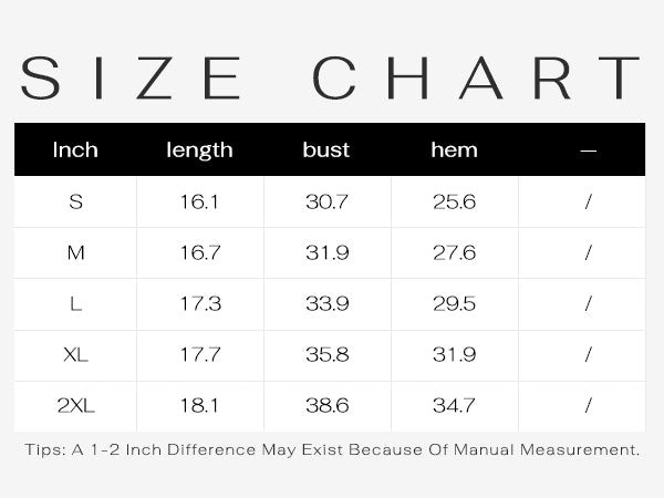 Size: S--bust--30.7” ; M--bust--31.9” ; L--bust--33.9” ; XL--bust--35.8” ; 2XL--bust--38.6”. Model is 5’3 135lbs 32DD & Jean size 27/28 , size Medium.